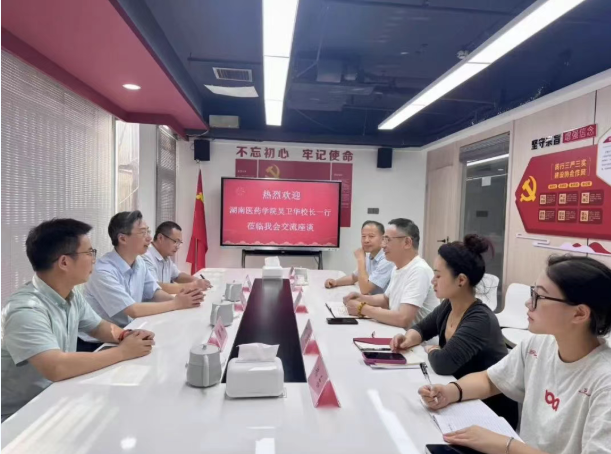 7月4日,湖南医药学院副校长吴卫华,药学院院长刘建新、副院长 蔡伟一行莅临我会参观座谈,协会会长易敬平、会员邹海波及协会秘书处热情接待并参与座谈。